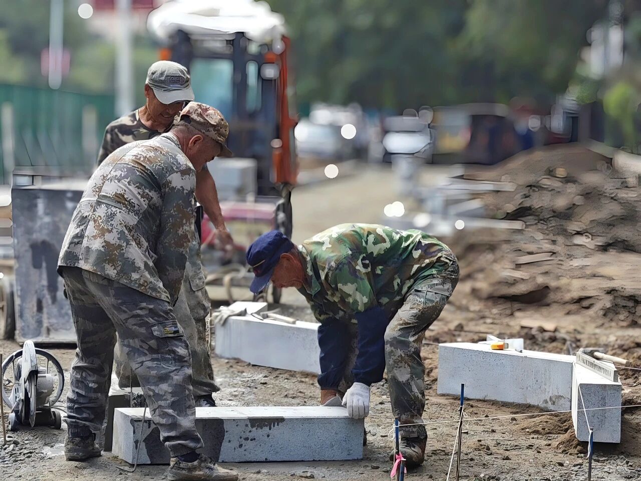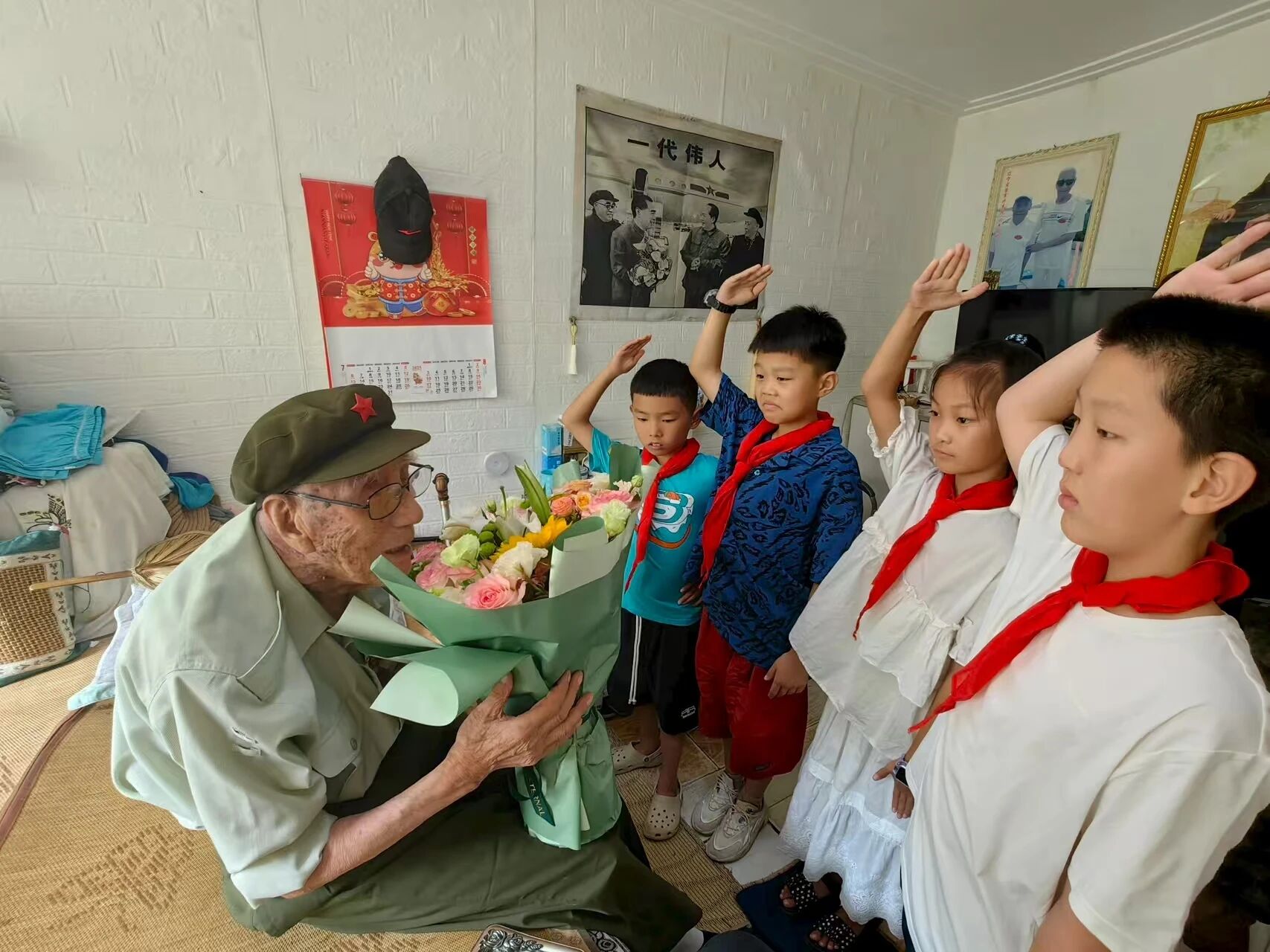 在整理作品时,许多画面深深烙印在我心中。有一张照片我至今难忘:瓢泼大雨中,三个人正弯腰疏通积水路面,雨水模糊了他们的面容,却清晰映出他们齐心协力推动排水工具的坚毅身影。另一张摄于老战士家中:老人身着旧军装,围绕着他的红领巾们昂首挺胸,行着队礼的小手整齐划一,稚嫩的脸上写满敬仰。最让我动容的是一位工人在作业中汗如雨下,却依然扬起灿烂的笑容,仿佛疲惫在那一刻被希望照亮。这些画面,让我如此真切地触摸到这座城市的温度与心跳。
