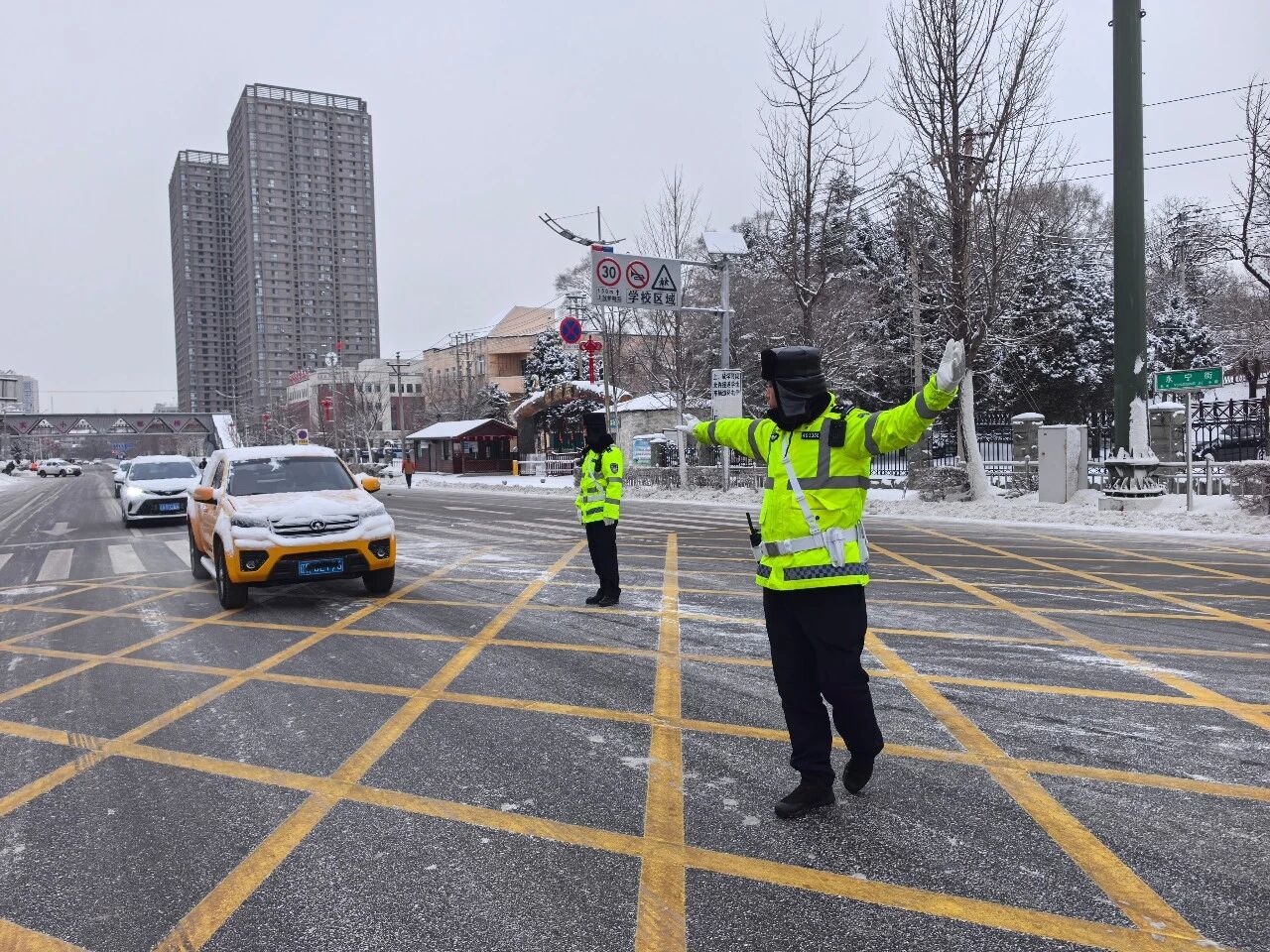 昨日,我市迎来降雪天气,路面湿滑、能见度降低,给市民出行带来诸多不便,全市交警闻令而动,奔赴各主要路口、易滑路段疏导交通,用坚守为群众筑牢雪天出行的安全屏障。