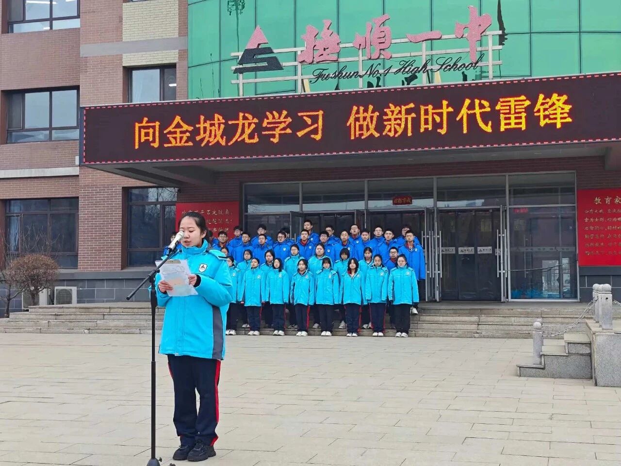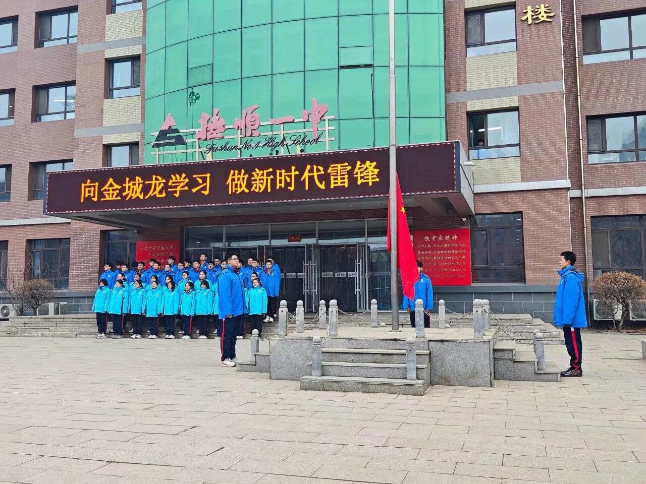 2026年春季开学首日,抚顺市第一中学举行“向金城龙学习,做新时代的雷锋”主题升旗仪式。全体师生共同学习金城龙同志信念坚定、无私奉献的先进事迹,深刻感悟新时代雷锋精神内涵。学校号召全体师生以金城龙为榜样,将榜样力量转化为行动自觉,厚植家国情怀、勇担时代使命,以昂扬姿态开启新学期,争做雷锋精神的传承者与践行者。