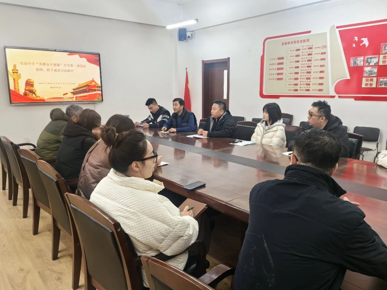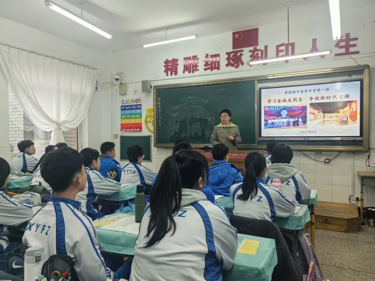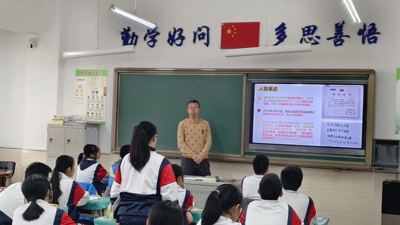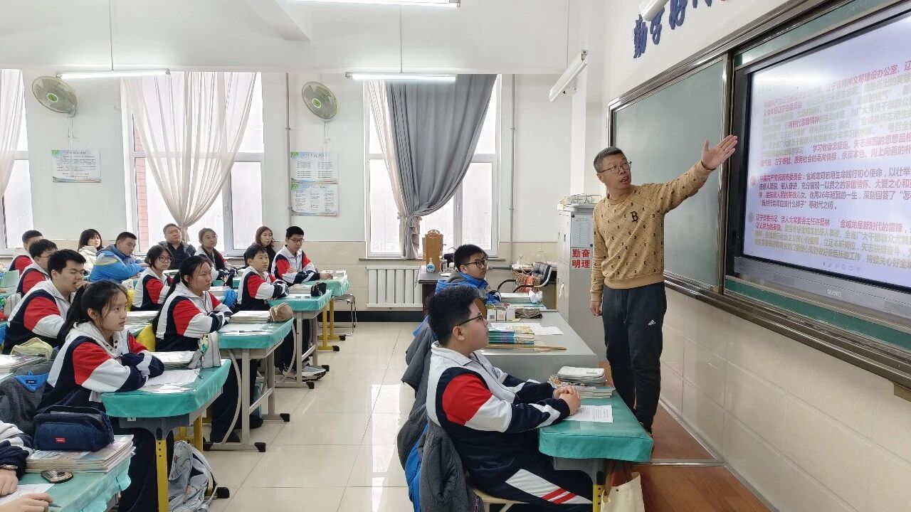 2026年3月3日,抚顺市实验中学领导班子和全体思政课教师走进9年10班,聆听了段兴宇老师题为“学习雷锋精神,争当文明先锋”的思政课。课上段老师与同学们一起学习了雷锋精神的内涵,向同学们介绍了新时代楷模金城龙同志的事迹,并探讨怎样践行雷锋精神。课后领导班子和全体思政教师进行了专题交流研讨。