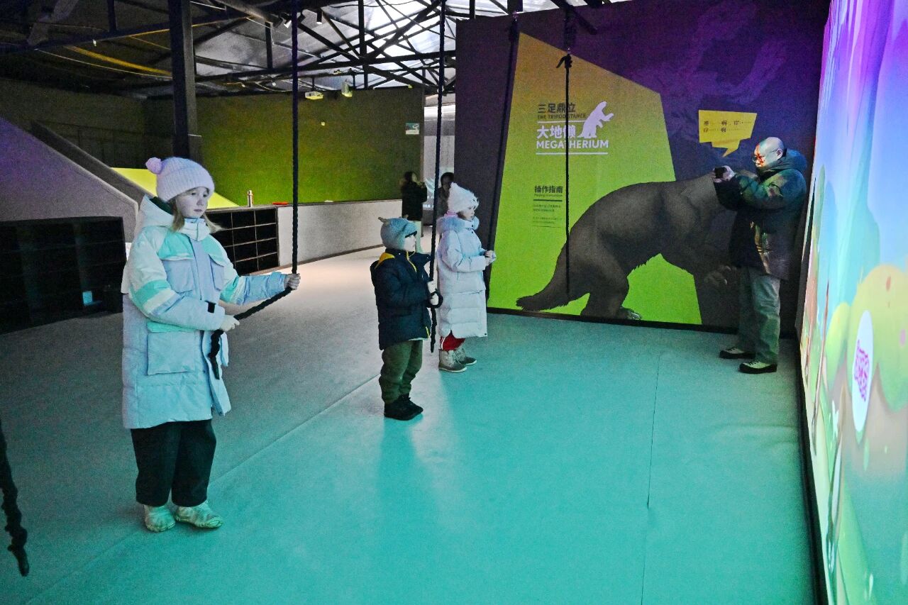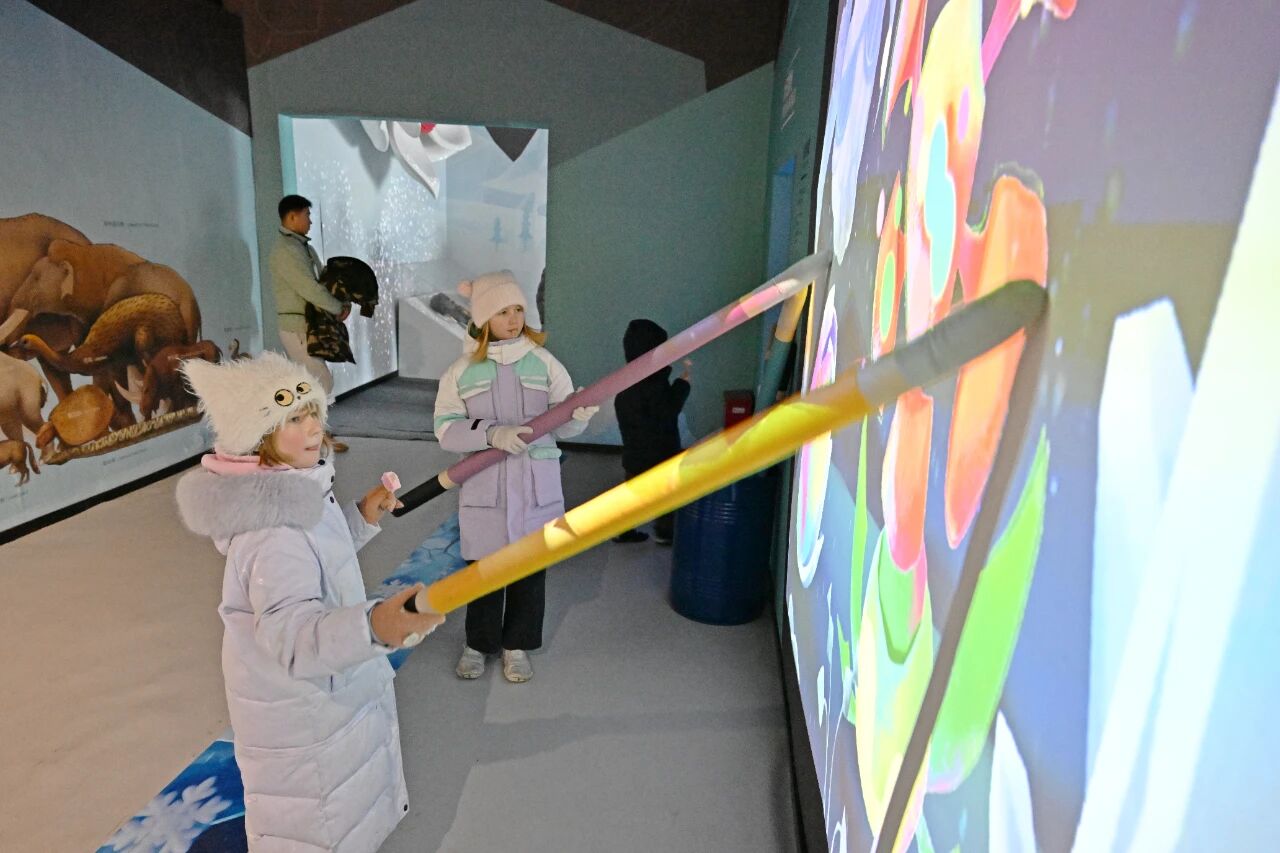 “冰雪+科技”的体验是孩子们最喜欢的环节。达莎带着妹妹米拉和弟弟鲍里斯畅玩1000平方米的冰河时代沉浸式体验馆——冰河秘境梦幻乐园,体验呼唤猛犸象DIMA领取梦幻烟雾泡泡、拿着电子画笔为冰川植物填色、跟冰川动物比身高、参与趣味恐龙运动会、开启冰河时代动物知识大学习等,精彩有趣的互动体验项目,让孩子们在游玩中收获知识。