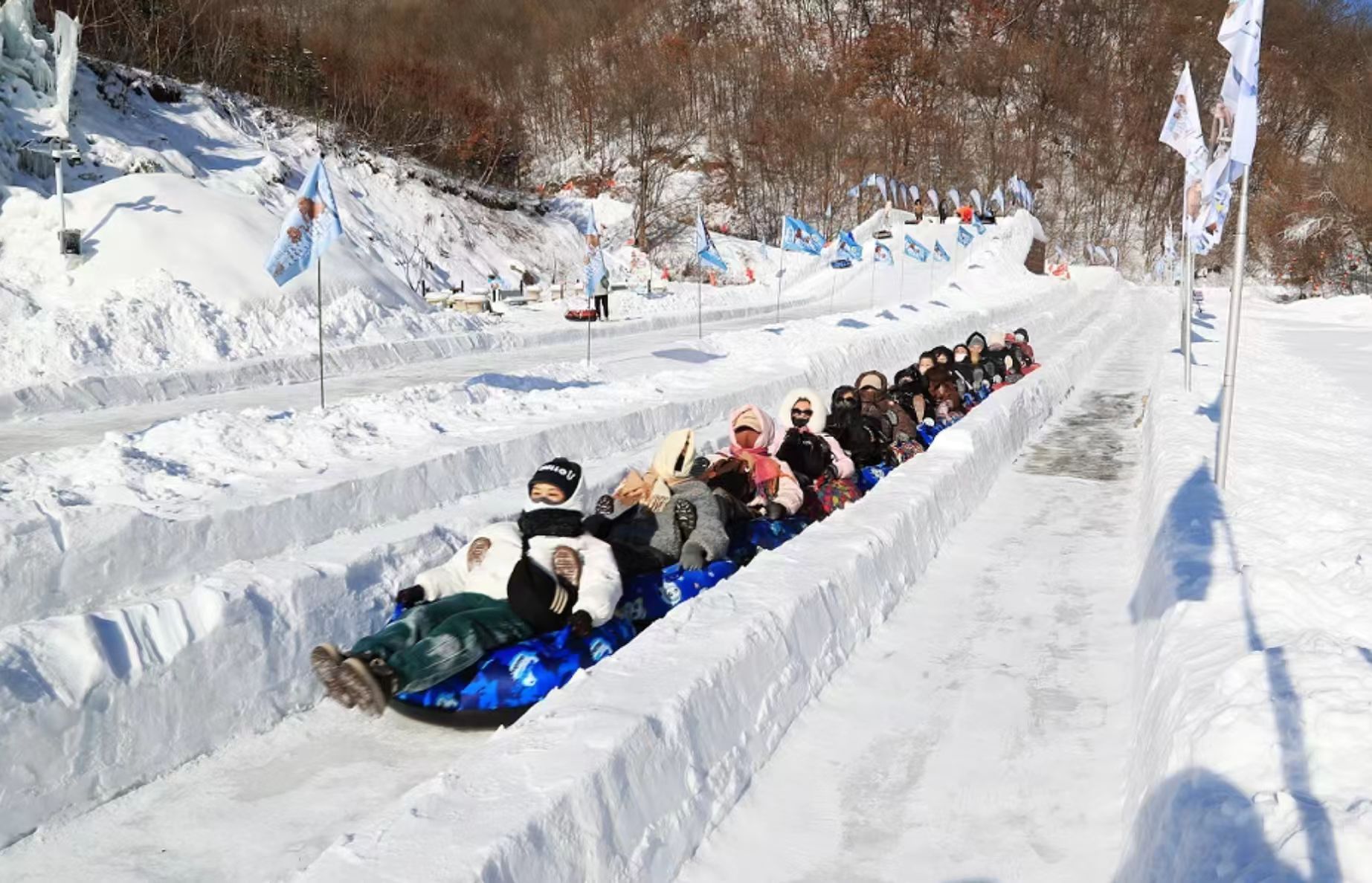 「避开同质化竞争,深挖本土特色是我们的核心思路。」尚宏伟介绍,天女山立足「天女木兰故乡」的独特IP,集中力量打造两大核心产品,构建起差异化竞争力。在「冰河巨兽」科技体验馆内,景区将天女木兰文化与远古冰河时代场景深度融合,通过VR、AR等数码技术,让猛犸象、剑齿虎等史前巨兽「穿越」而来,以「冰雪+科技+文化」的创新形式,为游客带来沉浸式科普娱乐体验,填补了省内冰雪旅游中文化科技融合的空白。而另一款爆款产品「雪地高铁」,则巧妙利用天女山「十八弯」的天然地形,打造出1500米极速雪道,包含150米S弯激流段与300米大S弯漂移段,将传统雪圈玩法升级为自带流量的网红项目,凭借「玩的就是心跳」的体验感,吸引无数游客打卡,更获央媒《新闻直播间》点赞推荐。